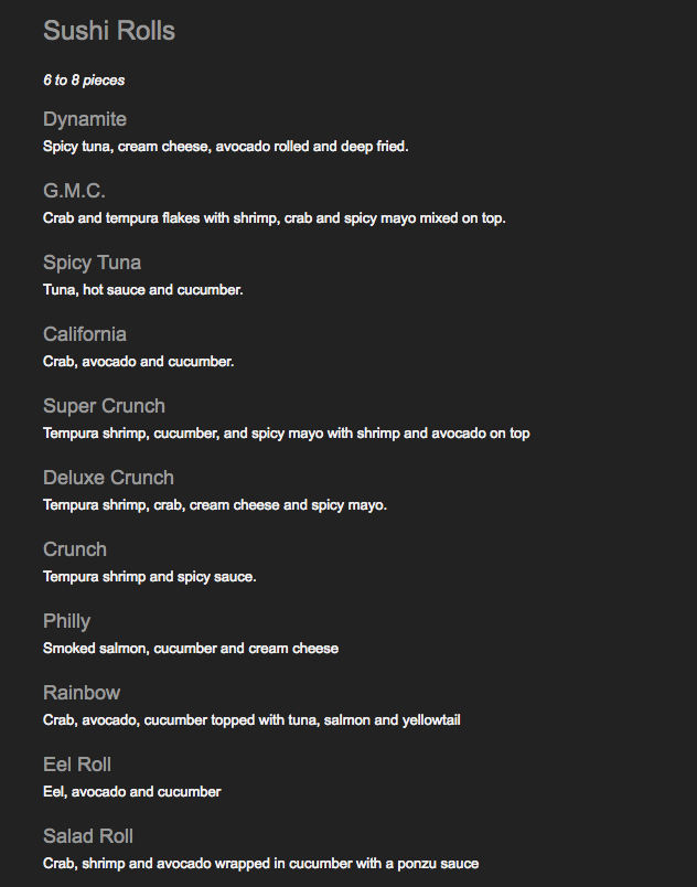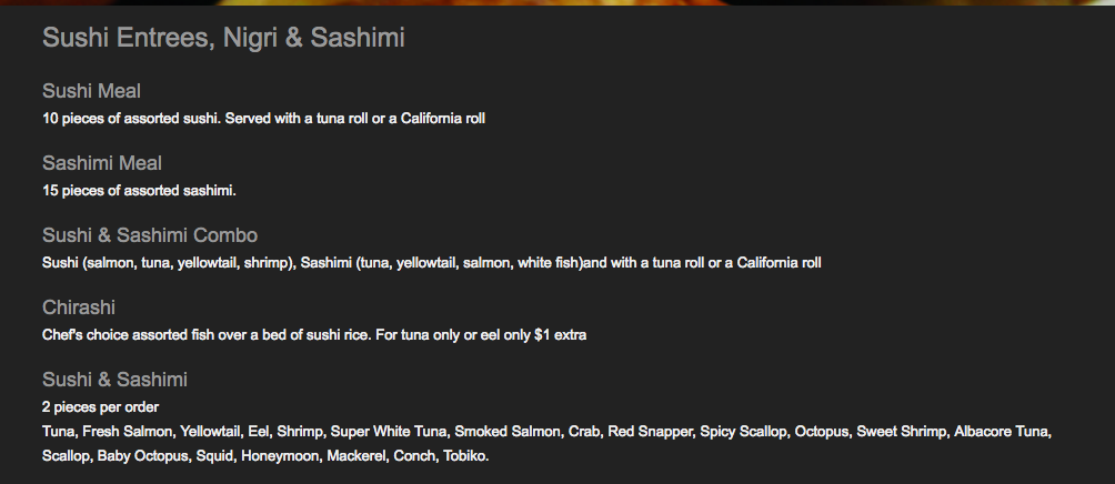 2 pieces per orderTuna, Fresh Salmon, Yellowtail, Eel, Shrimp, Super White Tuna, Smoked Salmon, Crab, Red Snapper, Spicy Scallop, Octopus, Sweet Shrimp, Albacore Tuna, Scallop, Baby Octopus, Squid, Honeymoon, Mackerel, Conch, Tobiko.