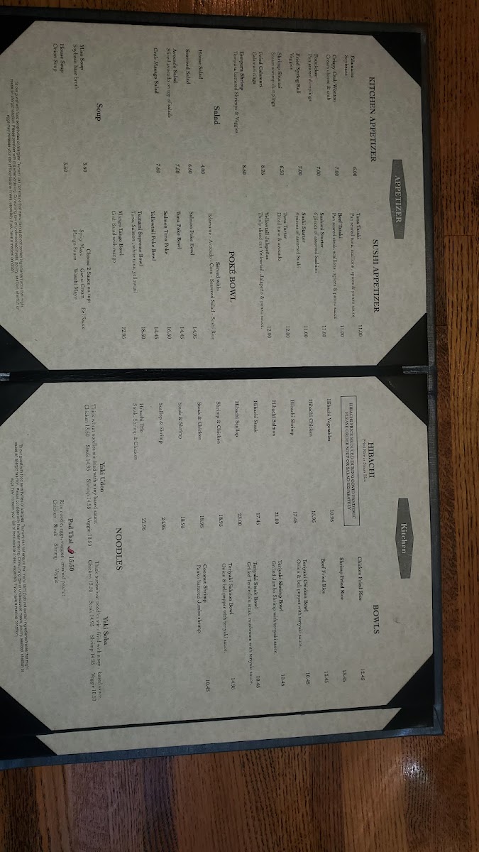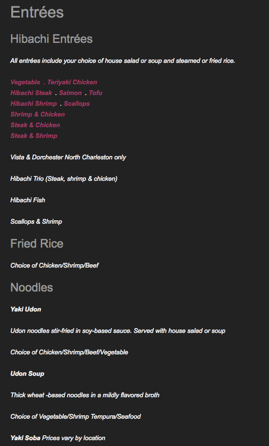 All entrées include your choice of house salad or soup and steamed or fried rice.Vegetable . Teriyaki Chicken Hibachi Steak . Salmon . Tofu Hibachi Shrimp . Scallops Shrimp & Chicken Steak & Chicken Steak & Shrimp Vista & Dorchester North Charleston only Hibachi Trio (Steak, shrimp & chicken)Hibachi Fish Scallops & Shrimp